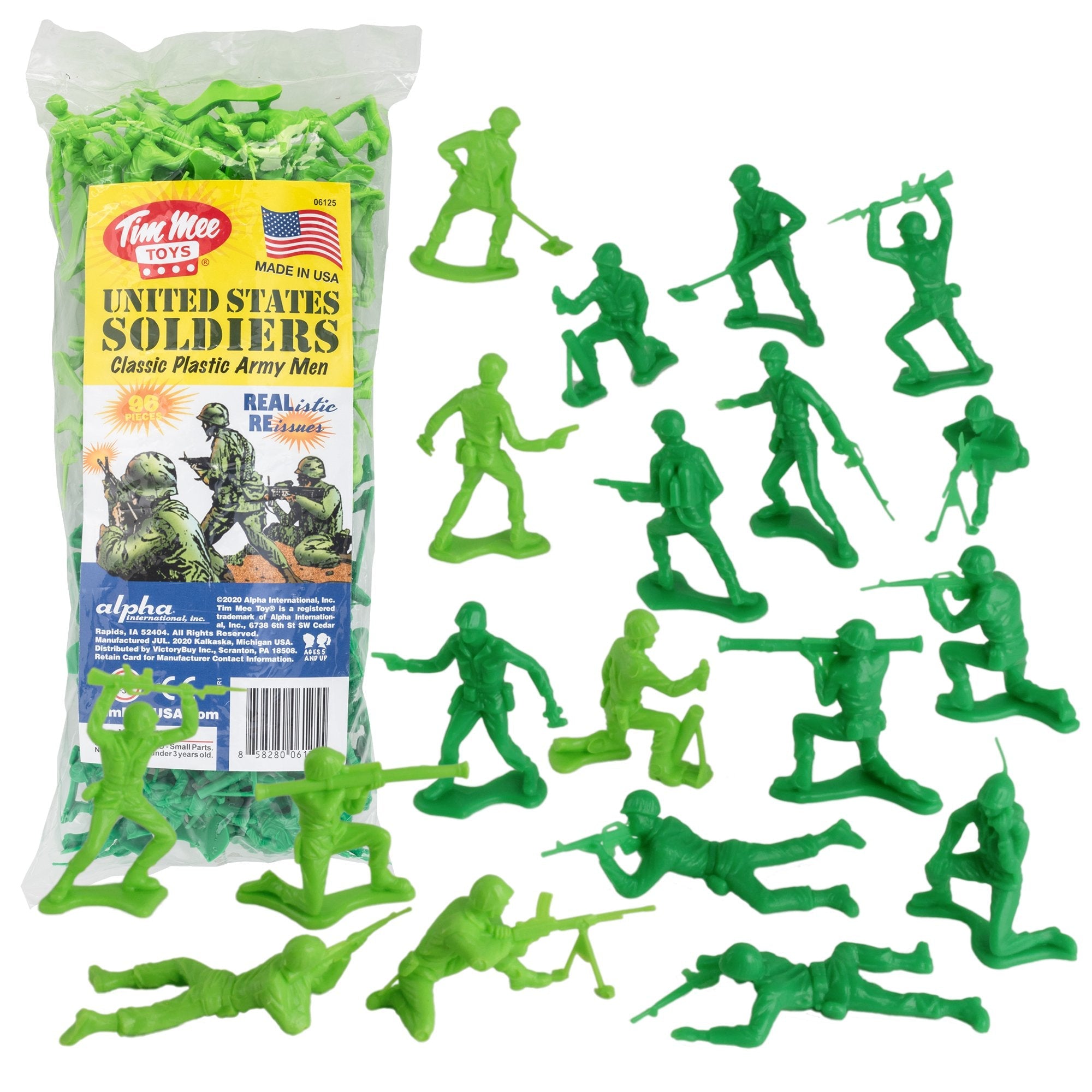An American Classic that has always been green. This bag of 96 Tim Mee Toy Plastic Army Men is proudly manufactured in the United States, and includes 48 Lime-Green and 48 Medium-Green troops for maximum play value. There's about 12 different figures and all your old favorites are here, including minesweeper, bazookaman, radio operator, 60mm mortar, light MGner, kneeling rifleman, flame thrower, crawling rifleman, prone rifleman, bayonet fighter, and officer with binoculars. Figures stand up to 2.1 inches tall and are approximately 1:35 scale. Made from slightly flexible LDPE plastic with medium detail and very little flashing. Originally produced by Processed Plastic Co. (Tim Mee Toy's parent company at the time) around 1968, these figures were probably the first to depict US Infantry troops of the Middle Cold War era with contemporary equipment that included M16 A1 rifles and an experimental Stoner 63A light MG. The manufacturer has even restored the vintage Tim Mee Toy logo that hasn't been seen on the shelves for decades. These are real plastic heroes, meant to be set up, knocked down, picked up and played with for years to come. Little Green Army Men have even been inducted into the National Toy Hall of Fame. Packed in clear bag with header card and recommended for ages 5 and up.