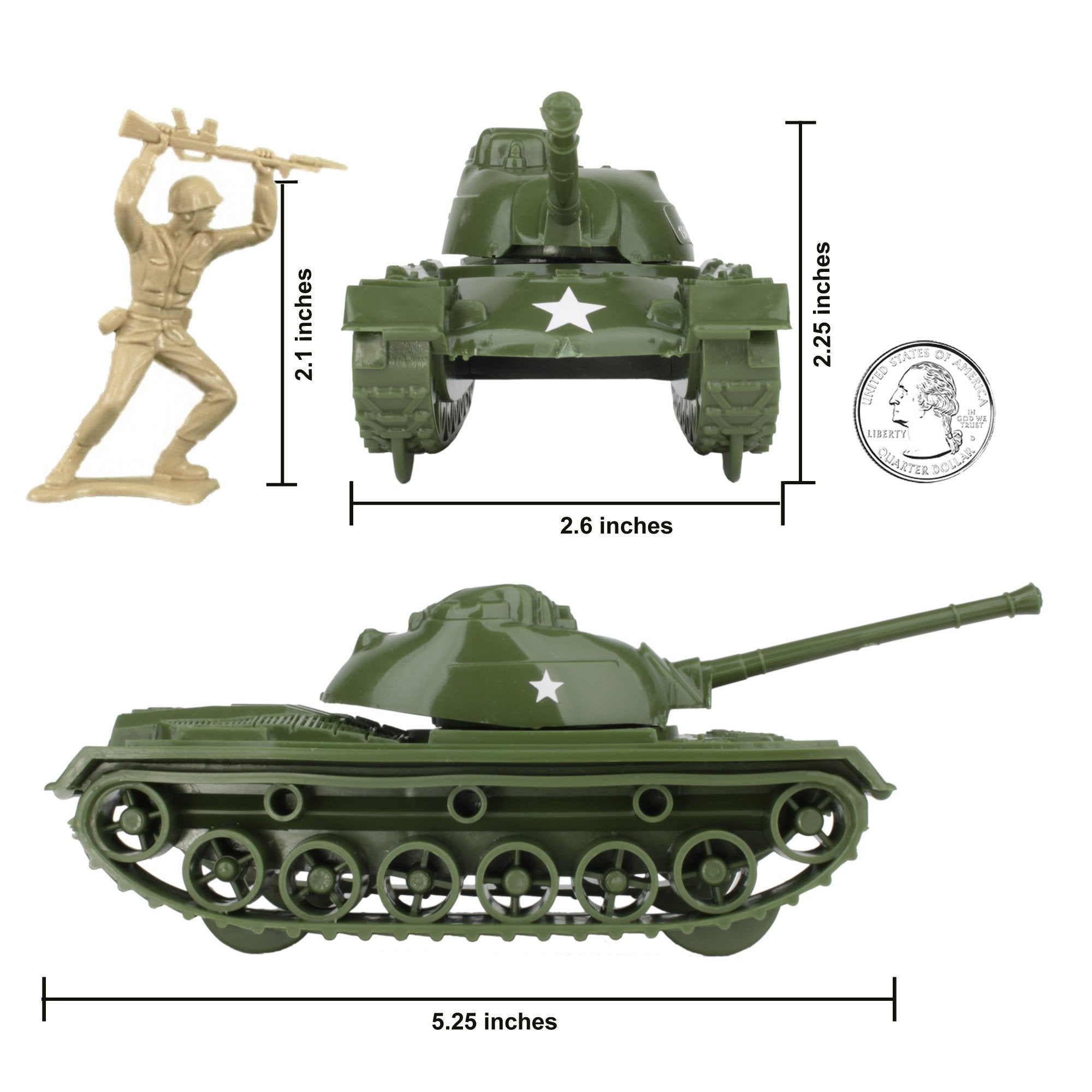 | The Original Toy Soldier Bucket is back. The TimMee Desert-Tan vs. Olive-Green Bucket of Army Men includes 24 Olive-Green and 24 Desert-Tan plastic Army guys, a Mountain, Olive-Green Patton Tank, tan Fighter Jets, and 2 flags, all packed in a sturdy plastic bucket. All pieces are proudly manufactured in the United States from HDPE & LDPE plastic with medium detail and just a little flashing. There are 12 different figures and all your old favorites are here, including minesweeper, bazookaman, radio operator, 60mm mortar, light MGner, kneeling rifleman, flame thrower, crawling rifleman, prone rifleman, bayonet fighter, and officer with binoculars. Figures stand up to 2.1 inches tall (54mm). Danger Mountain features 4 precarious ledges and is is made from sturdy gray color plastic (not thin vacu-formed) and measures 6.5 inches diameter by 5.75 inches tall. Tan has air Support from smaller scale F-14 and F-15 Fighter Jets that measure nearly 7 inches long. Green's secrete weapon is their M48 Patton Tank that features a turret that rotates. Scales from 1:32 to 1:100. Bucket arrives packaged in a plain box optimized for shipping directly to you. These are real toys, meant to be set up, knocked over, picked up and played with for years to come. Little Green Army Men have even been inducted into the National Toy Hall of Fame. Recommended for ages 5 and up.