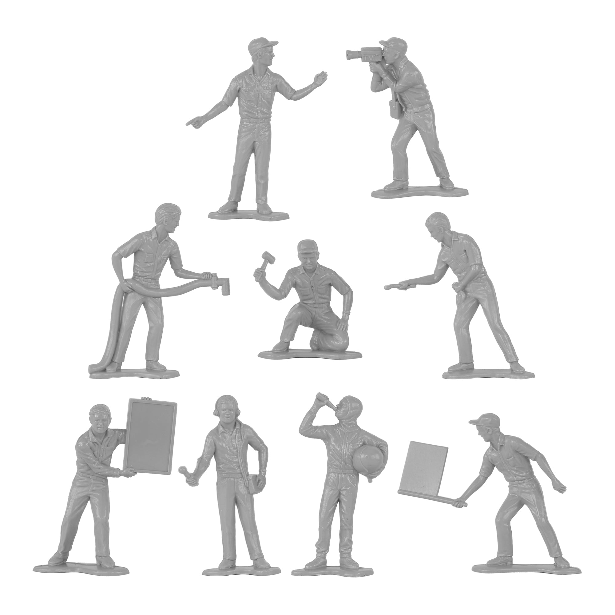 Specialists and Support Crews for your Plastic Army are ready for action. This Set of 18 Tim Mee Toy Plastic Army Men is proudly manufactured in the United States, and includes gray troops in 9 poses for maximum play value. Features test pilot, mechanics, ground crew, and even a film and sound crew. Figures stand up to 2.5 inches tall and are approximately 1:32 scale. Made from slightly flexible LDPE plastic with medium detail, and a little flashing. Originally produced around 1966 by Processed Plastic Co. (Tim Mee Toy's parent company at the time). These figures were initially offered as Speedway Pit Stop Indy Car Racing and later branded as NASCAR. They were usually plastic injection tooled in Red, White and Blue colors and often included with race cars as well as separately in a bag with a traffic cone. These are real plastic heroes, meant to be set up, knocked down, picked up and played with for years to come. Little Green Army Men have even been inducted into the National Toy Hall of Fame. Packed in clear bag with insert card and recommended for ages 5 and up.