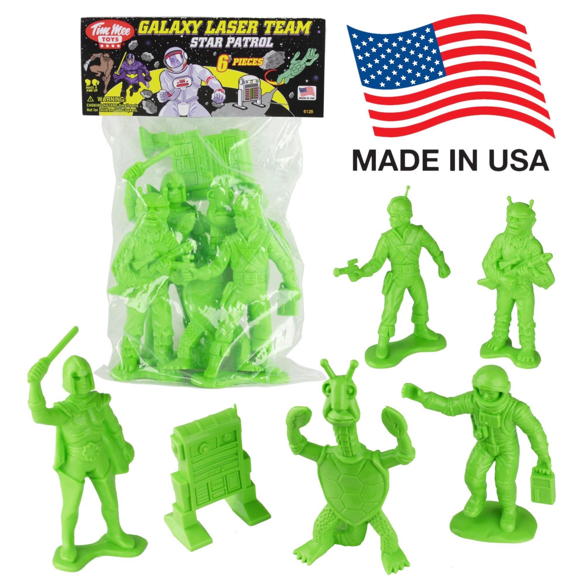 Return of the Jumbo: From a Galaxy far-out and away, long-lost classic underground Sci-Fi toys from the 70's are back--BIG time. This Set of Tim Mee Toy Galaxy Laser Team - Star Patrol figures is proudly manufactured in the United States, and includes six Lime-Green figures of considerable size. All the favorites are here, including turtle-lobster alien, space-sasquatch alien, classic serial space hero, mailbox-shaped droid, sword-wielding villain, and even a Mercury era astronaut.