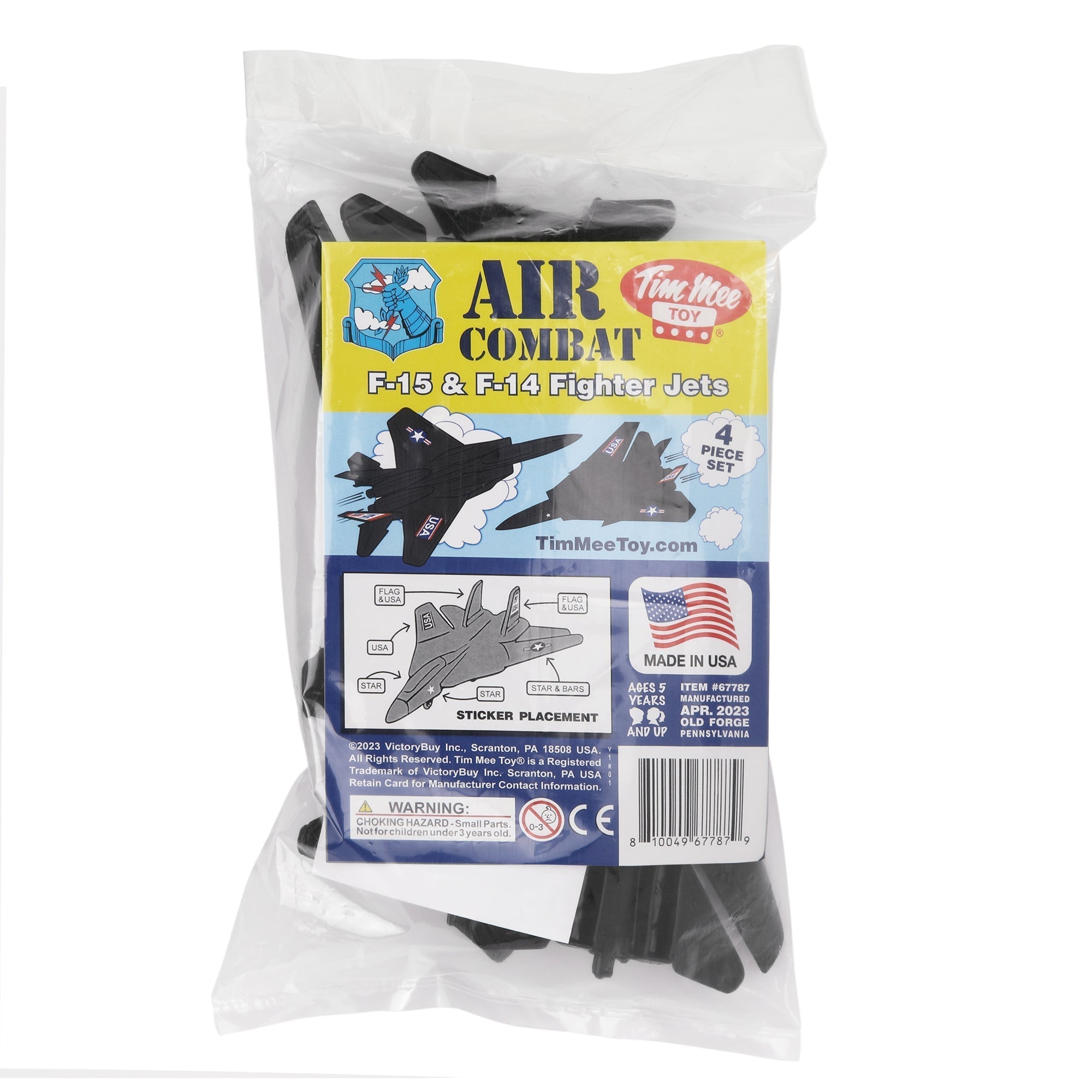 The Tim Mee Toy F14 & F-15 Aerial Combat Fighter Jets are ready to provide maximum air support to your Plastic Army Men on the ground. This 4 piece Set of aircraft are proudly manufactured in the United States and each plane measures 6.9 inches long with 4.6 inch wingspan. Approximately 1:100th to 1:144th scale and made from slightly stiff Black color HDPE plastic with a medium amount detail and a little flashing. Also includes optional sticker sheet. These airplanes are modeled after the Grumman F-14 Tomcat and McDonnell Douglas F-15 Eagle fighter jets. Processed Plastic Co. (Tim Mee Toy's parent company), first produced these airplanes sometime around 1990, and they were included in many different Sets including Battle Mountain, the Giant Aircraft Battle Carrier, and even a tour as bright yellow 'Space Jets' in the Star Battle boxed Set along with the infamous Galaxy Laser Team space figures.. These are real American Made toys, meant to be set up, knocked over, picked up and played with for years to come. Recommended for ages 5 and up.