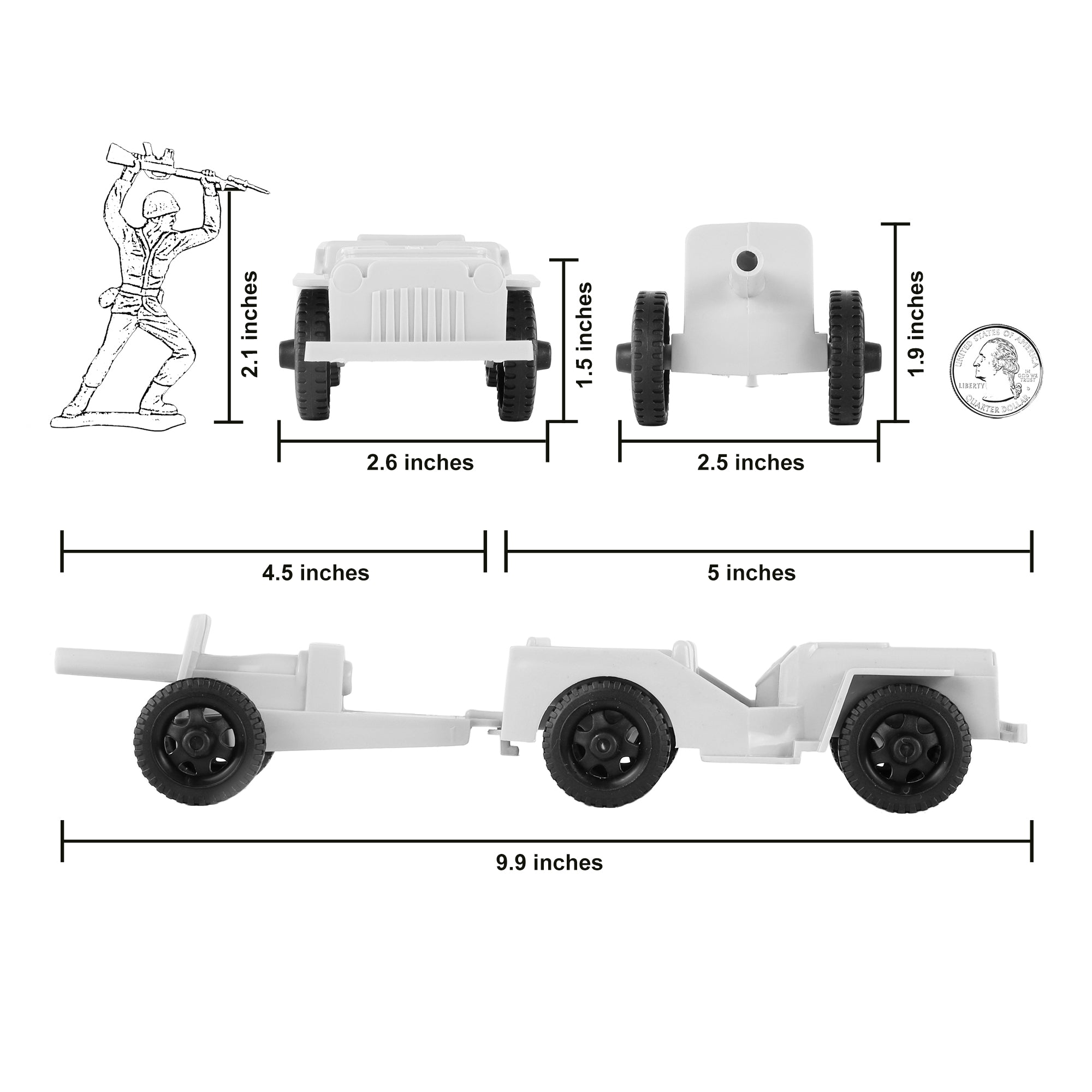 The Tim Mee Toy Combat Patrol is out of retirement and ready for redeployment. These Willys vehicles and Artillery are proudly manufactured in the United States and available in this 4 piece Set that includes 2 vehicles and 2 anti-Tank cannon. They feature smooth rolling wheels with metal axles, measure nearly 10 inches long when hitched together, and are approximately 1:24 scale. Made from slightly stiff White color HDPE plastic with lots of crisp detail and very little flashing. Modeled after the Willys MB Army vehicle and the M3 37mm Artillery.