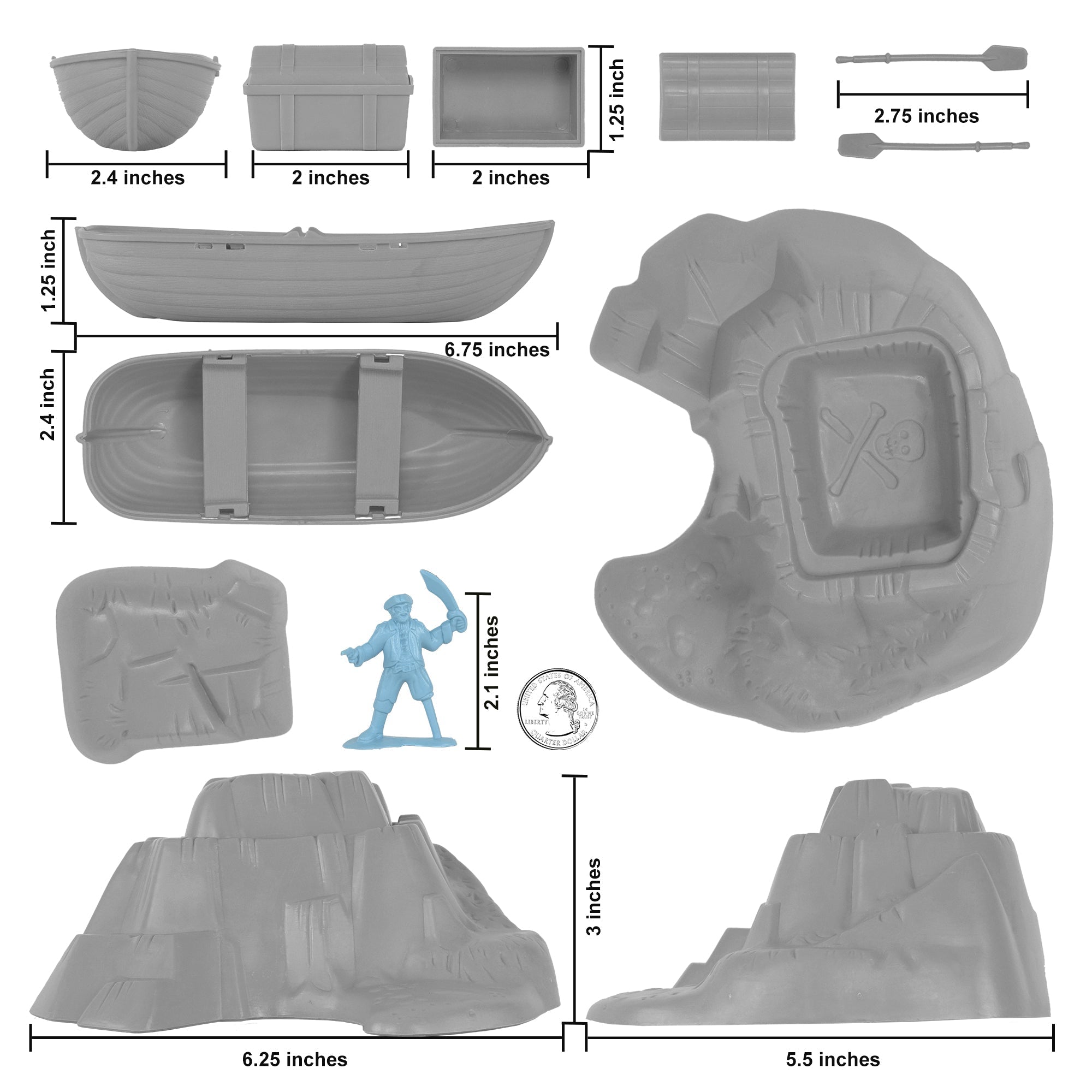 The Tim Mee Toy Pirates of Treasure Island are ready for your swashbuckling adventures on the high seas. This 28 piece Set of is proudly manufactured in the United States, and includes 24 pirate figures in 7 poses for maximum play value. Also includes a pirate flag, row boat, Secret Island, and a Treasure Chest. The buccaneers stand up to 2 inches tall with medium detail, very little flashing and are approximately 1:40 scale. The figures are made from slightly flexible Powder-Blue color LDPE plastic and accessories are made from Gray color HDPE plastic. The Island measure 6.25 x 5.75 x 3 inches tall and features a removable top that reveals a perfect spot to hide the treasure chest or use as a defensive position. The treasure chest measures 2 x 1.25 x 1.25 inches tall with a removable lid. The wooden rowboat is 6.75 inches long includes 2 oars and bench seats. Originally produced in the 1990's by Processed Plastic Co. (Tim Mee Toy's parent company at the time) and were offered in a variety of bagged, boxed, and bucket Sets. These figures and accessories are a fun addition to any pirate themed Playset or school project diorama. These are real American Made plastic toys, meant to be set up, knocked down, picked up and played with for years to come. Packed in clear bag with insert card and recommended for ages 5 and up.