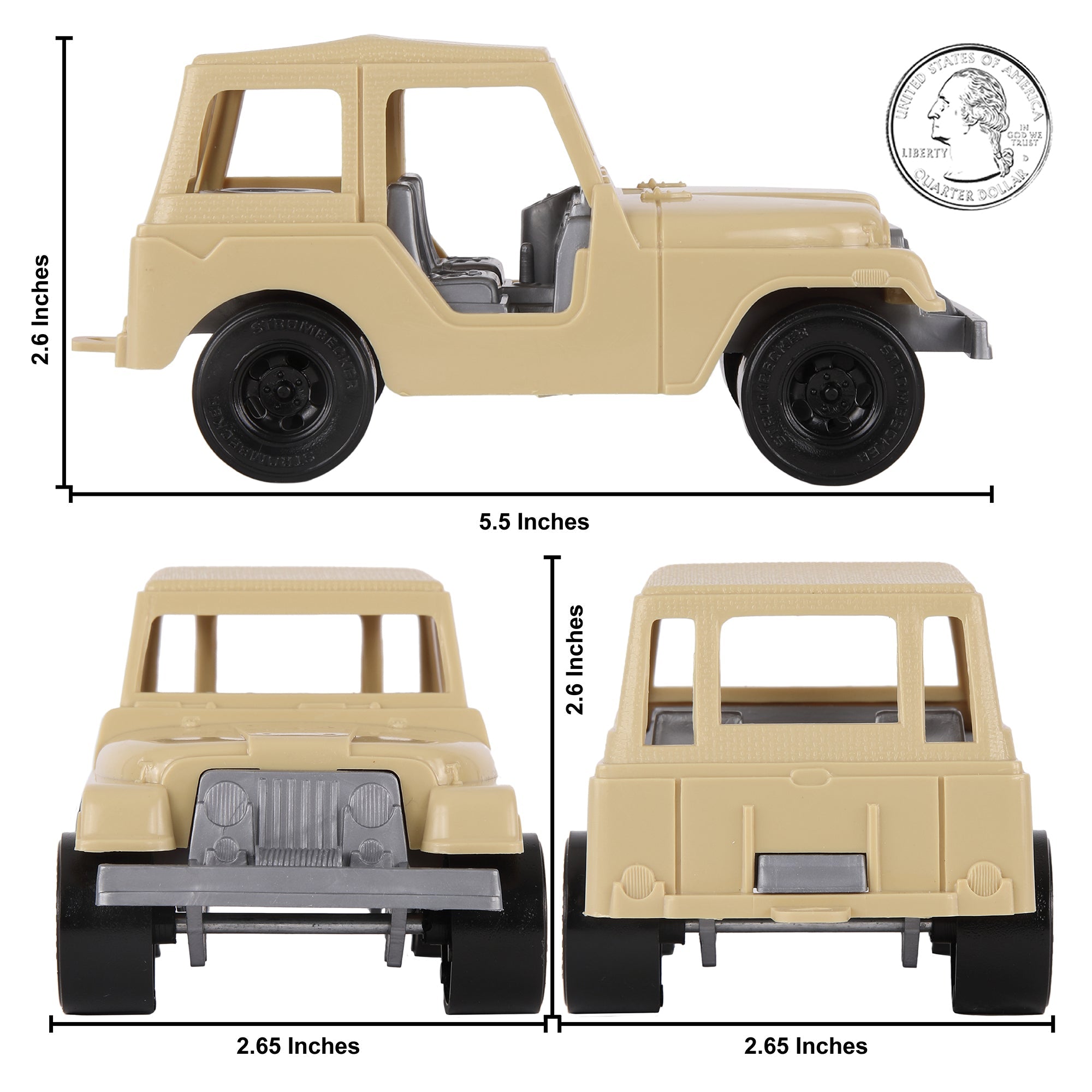 The Tim Mee Toy Battle Transport Vehicles are ready to roll out with your Plastic Army men. These Willys 1/4 ton and Light Pickup Trucks are proudly manufactured in the United States and available as this 2 piece. They feature smooth rolling wheels with metal axles, measure over 5 inches long and are approximately 1:32 scale. Made from slightly stiff Tan color HDPE plastic with crisp detail and very little flashing. These toy vehicles were originally produced around the 1970s by Strombecker Corporation and later offered under the Tootsietoy brand. The 2024 reissue features revised hitch that is compatible with the Tim Mee Toy M3 Artillery. Vehicles are also compatible in size and scale with the vintage Strombecker and Tootsietoy jeeps and trucks since they are manufactured with the original tooling. Most likely modeled after the Willys MD (M38A1) military vehicle and a custom or concept forward control pickup truck. Includes an optional sticker sheet with military and medical marking options. These are sturdy real American Made toys, meant to be rolled around, knocked over, picked up and played with for years to come. Packed in clear bag with insert. Recommended for ages 5 and up.