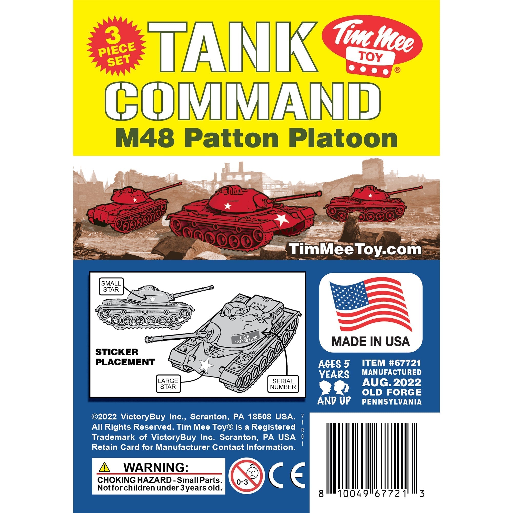 The Tim Mee Toy Patton PlatoonTank Division is ready for back yard deployment. These #729 M48 Patton Tanks are proudly manufactured in the United States and available in this 3 piece Set. Each Tank features a turret that rotates, measures 6.5 inches long and is approximately 1:48 scale. Made from slightly stiff red color HDPE plastic with lots of crisp detail and very little flashing. Modeled after the M48A2 Patton Tank, Tim Mee Toy first produced this toy in 1964 and modified the tooling several times over the decades until the final version seen here. Pack includes optional sticker sheet with the classic stars and serial numbers and bonus mini-stars and Tim Mee Toy logo. This is likely the most popular and widely copied toy Tank of all time. These are real toys, meant to be set up, knocked over, picked up and played with for years to come. Recommended for ages 5 and up.