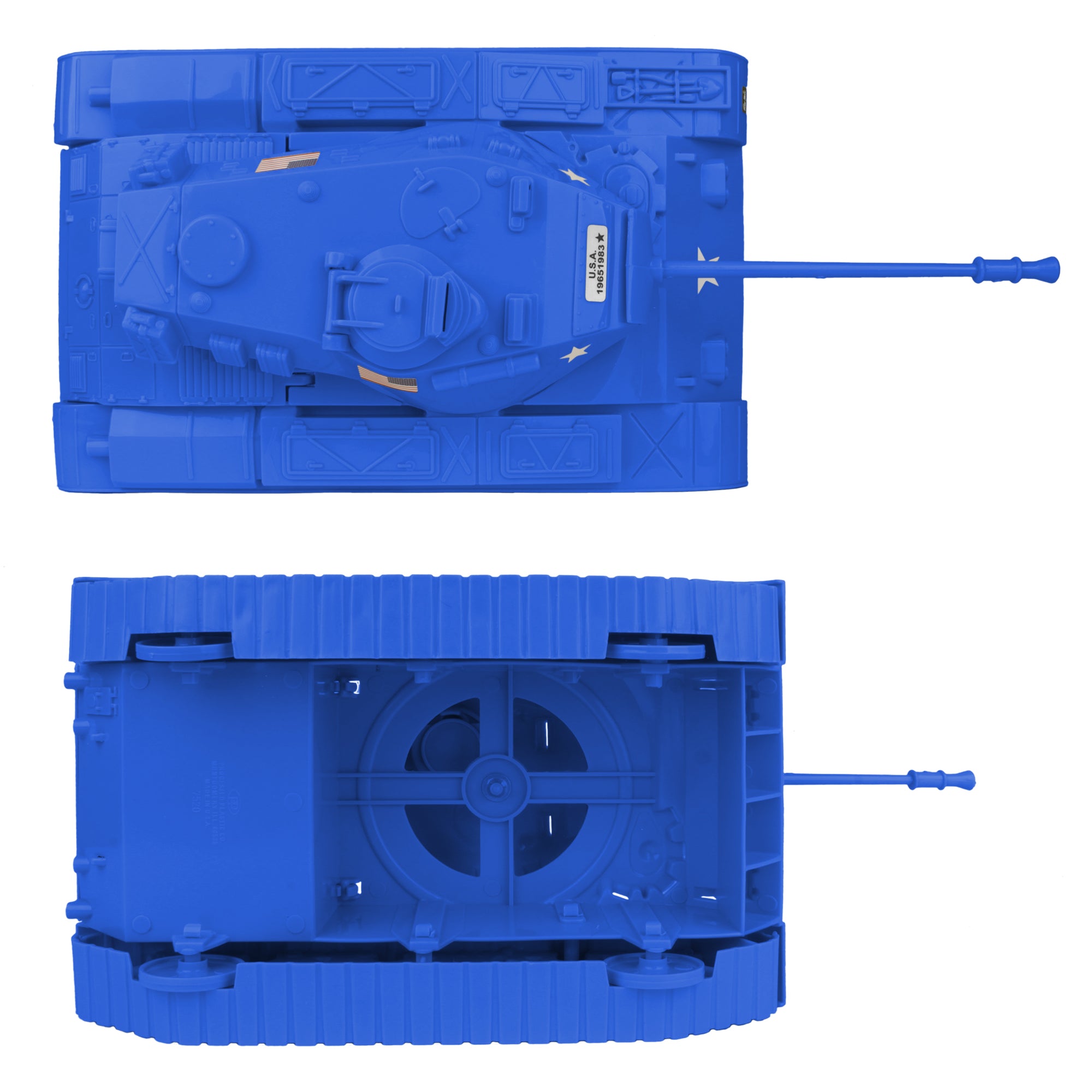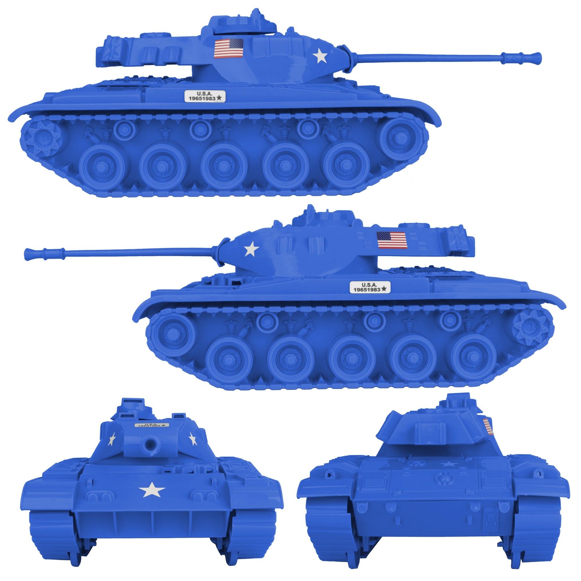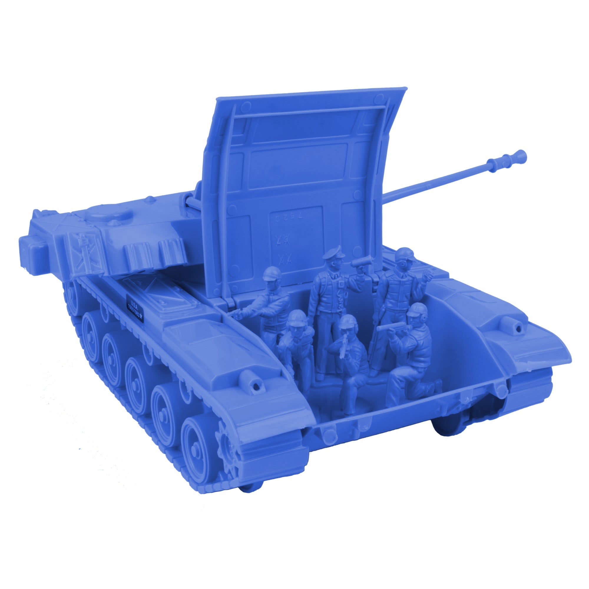 The Tim Mee Toy Walker Bulldog M48 Tank 13 piece Playset is ready for your next backyard battle. This #7520 Tanks is proudly manufactured in the United States and includes 12 tactical soldier figures. The Tank features an elevating barrel, turret that rotates, hatch that opens to reveal a fixed Tank commander, rolling wheels, and a storage compartment in the back. It measures 10.25 inches long (14 inches including barrel), 6 inches wide and is approximately 1:24 scale. Made from slightly stiff Blue color HDPE plastic with lots of crisp detail. The figures are made from slightly flexible LDPE plastic and feature a high level of detail with very little flashing. Figures stand up to 2.6 inches tall, are approximately 1:30 scale.